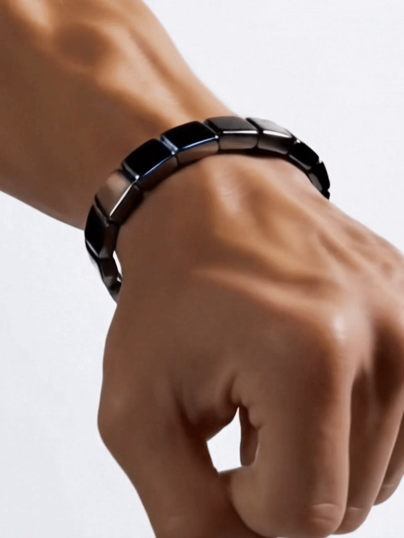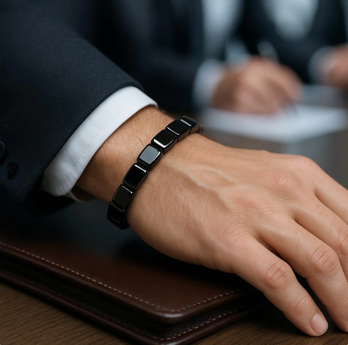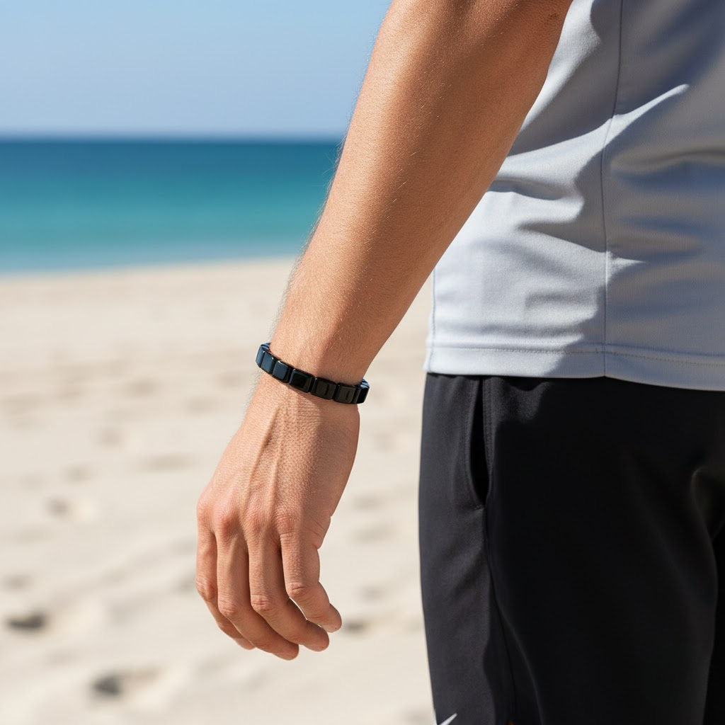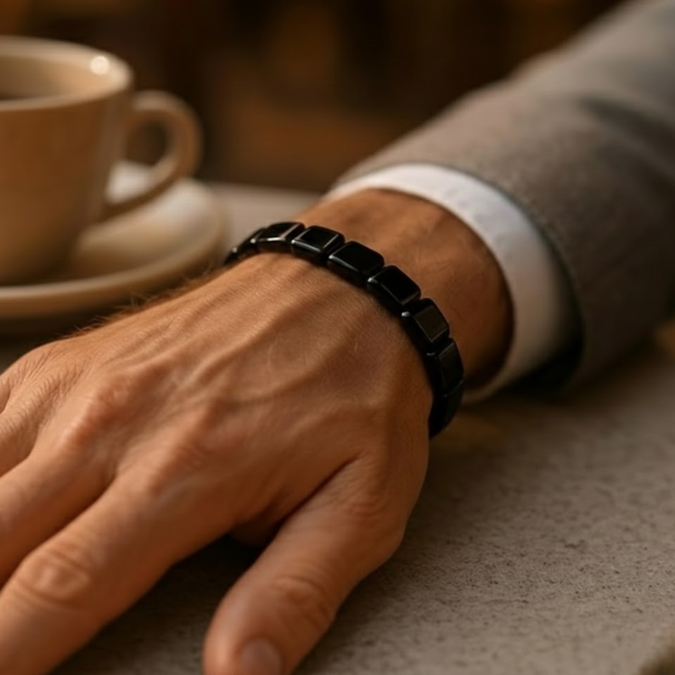 Tak, Model VITALIS jest całkowicie bezpieczny. Wykonany z naturalnego Hematytu, nie zawiera żadnych szkodliwych substancji. Jest to biżuteria męska przeznaczona do codziennego noszenia.
